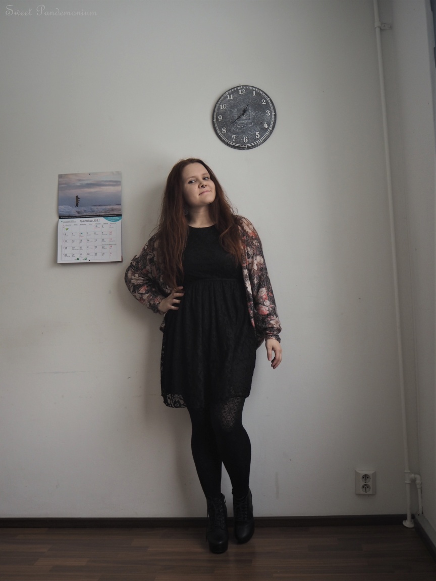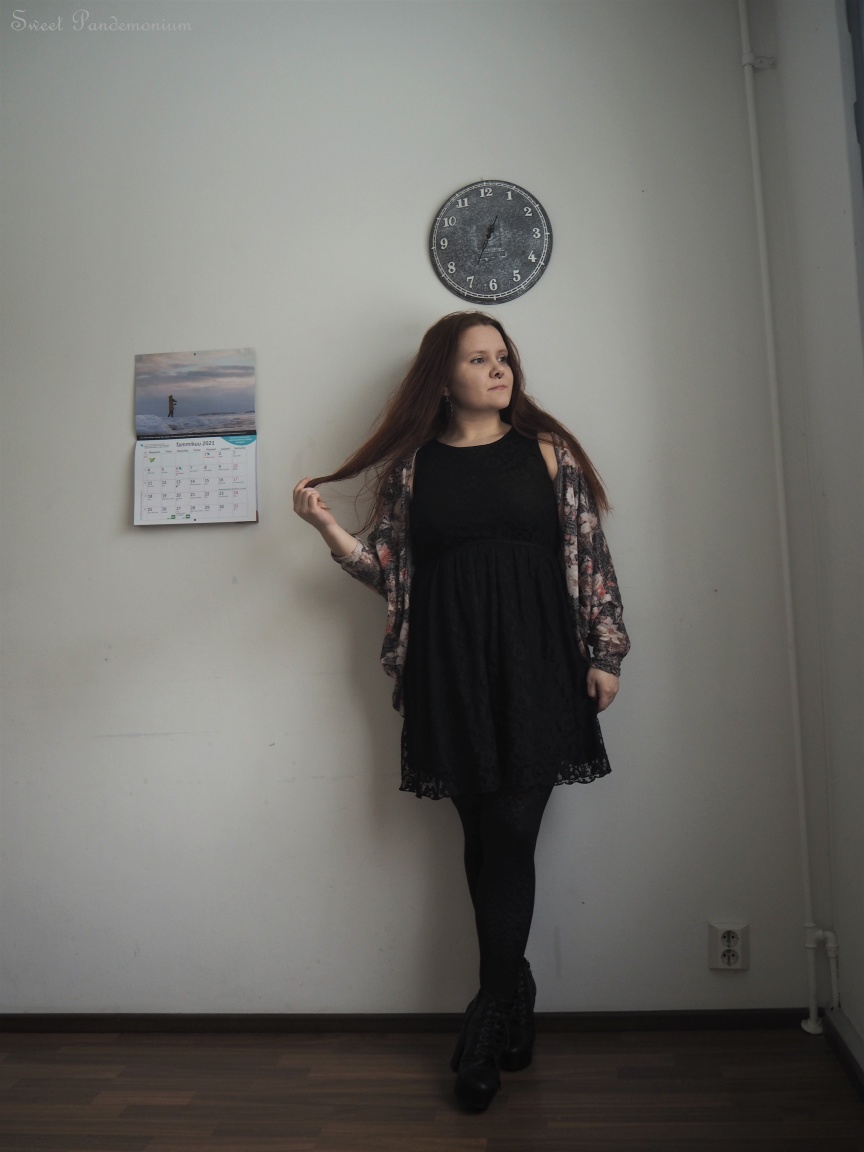 Paluu Turkuun tietää myös paluuta tylsiin taustoihin asukuvien kanssa, koittakaa kestää. :D Olisi niin kiva saada aina nätti tausta asuille, mutta kaupungissa asuessa en vaan kehtaa mennä yksin kuvailemaan ulos, ja ei minulla ole kunnon jalustaakaan. Pitäisi löytää täältä lähistöltä joku innokas valokuvaaja-bloggaaja, jonka kanssa voisi ottaa yhdessä kuvia! Nämä asut nappasin eilen. Olin kotona koko päivän, mutta halusin pukeutua muuhun kuin ainaisiin jumppatrikoisiin, joten valitsin kaapista kirparilta parilla eurolla vuosia sitten ostetun pitsimekon ja käytettynä saamani kukallisen neuleen. Sama asu oli minulla päällä viime viikon perjantaina, kun kävimme ulkona syömässä kavereiden kanssa. Saatiin ihan oma kabinetti varattua, niin ei tarvinnut stressata joukkoaltistumisia. Minun oli tarkoitus kuvatuttaa asu siellä, mutta valaistus oli ravintolassa huono kuvaamiselle. Keskiviikkona päätin sitten pukeutua samaan asukokonaisuuteen, sillä tykkäsin siitä paljon. Kenkiä en toki sisällä käytä, mutta laitoin ne jalkaan kuvia varten, kuvat näyttävät kivemmilta nättien kenkien kanssa. Huomaan myös, että etäpäivinä olen tehokkaampi, kun olen oikeasti panostanut pukeutumiseen, se luo sellaisen oikean työmoodin. Yleisin arkiasuni yleensä onkin yhdistelmä, missä on mekko ja jokin villatakki. Vaatekaapistani löytyy paljon erilaisia mustia ja vähän värikkäämpiäkin mekkoja, joten valinnanvaraa on. Tämä kirppikseltä ostettu pitsimekko on yksi lemppareistani vaikka onkin vyötäröltä väljä, yleensä pidän tyköistuvista mekoista enemmän. Mekko on tosi mukava päällä ja helppo yhdistää erilaisten neuletakkien kanssa. Kengät olen muistaakseni ostanut joskus H&M:ltä, tykkään tuollaisesta mallista todella paljon, paksu korko, nyörit ja pyöreät kengänkärjet. <3